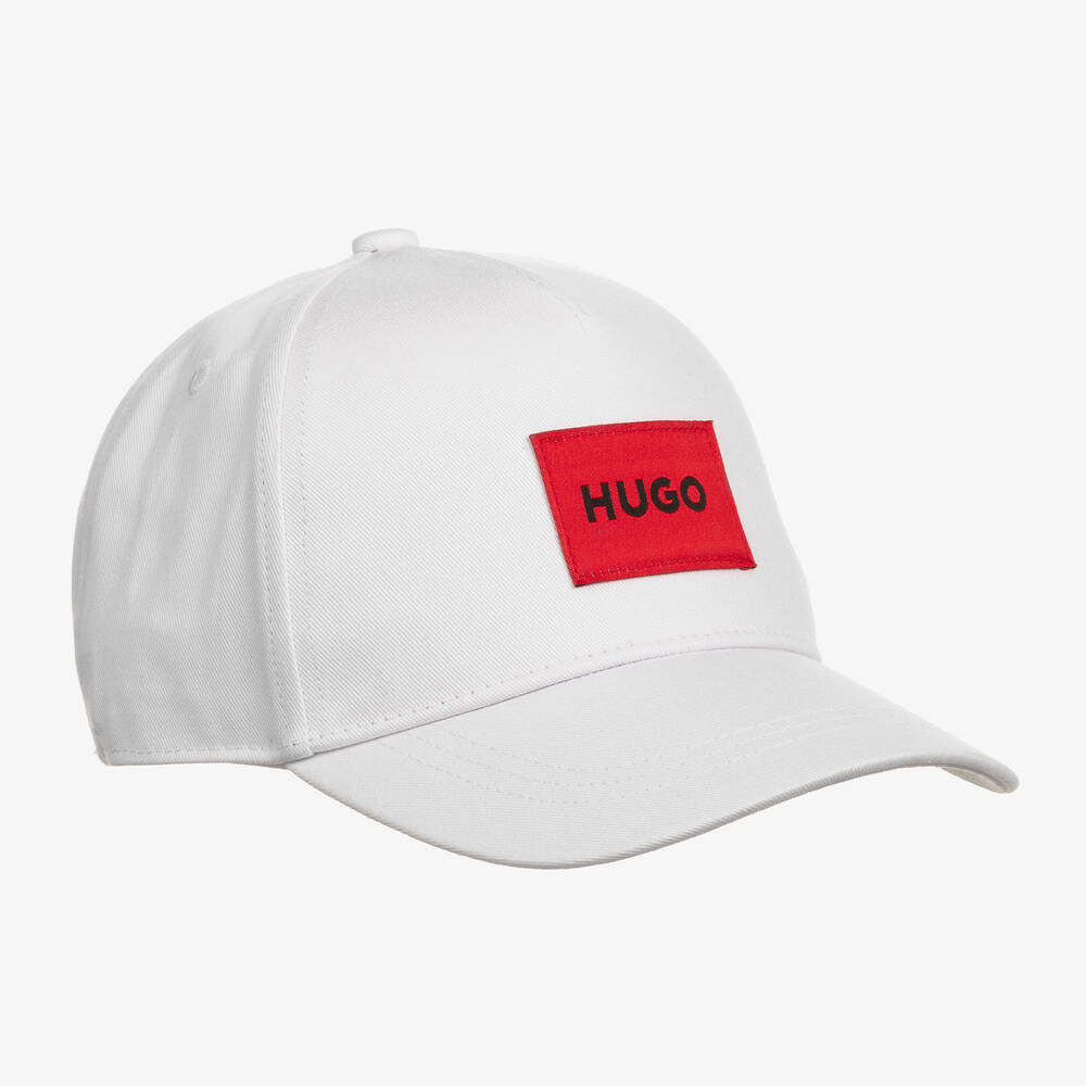 Classic white cotton twill baseball cap for boys and girls by HUGO. It has a black and red logo tab stitched to the front and logo tapings on the inside. For a comfortable fit, the back strap is adjustable with a metal slide buckle.
