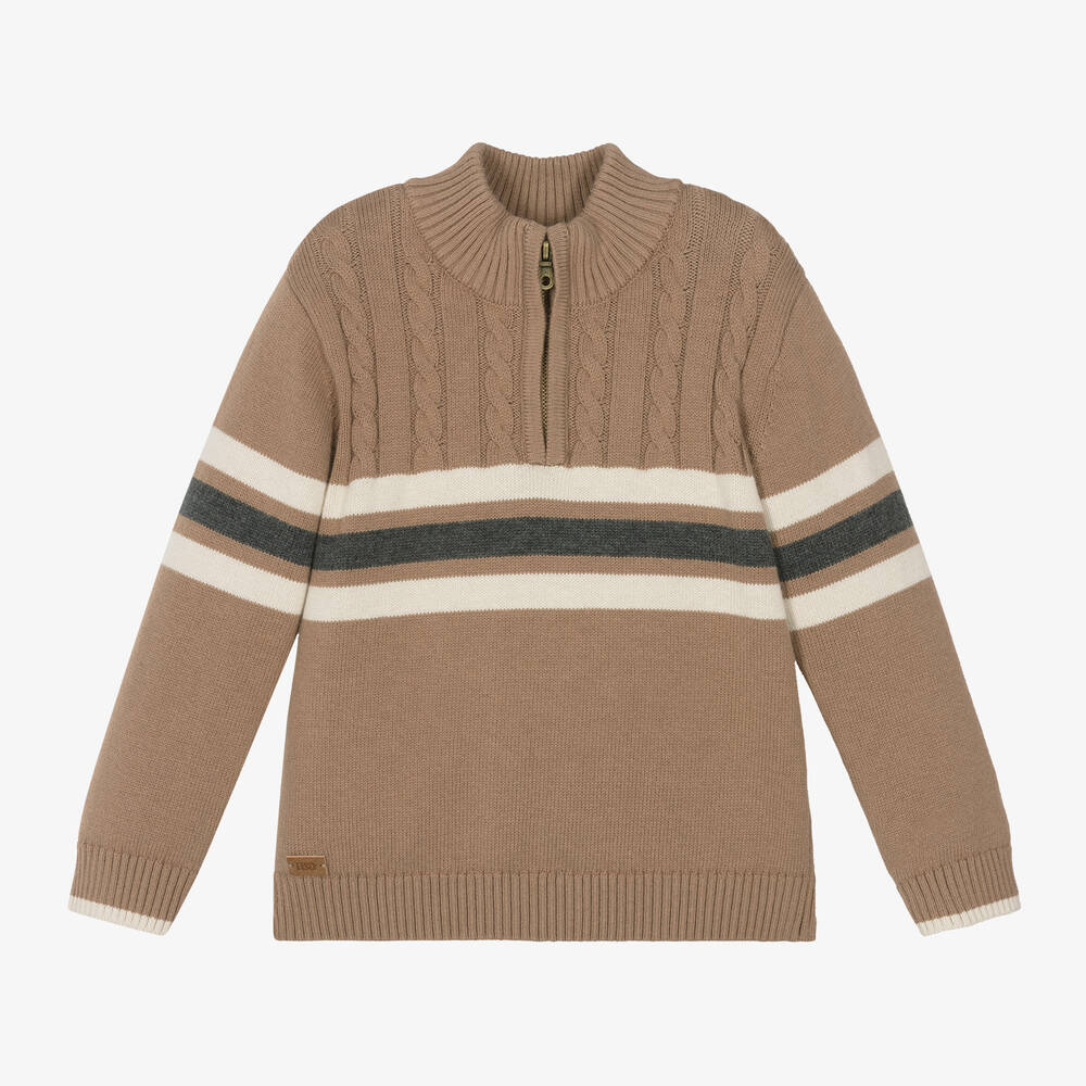 Beige sweater for boys by iDO Junior, knitted in a super soft cotton and wool blend. Styled with cable knit trims on the front, it has a sporty tripe across the chest and stylish quarter zip fastening.