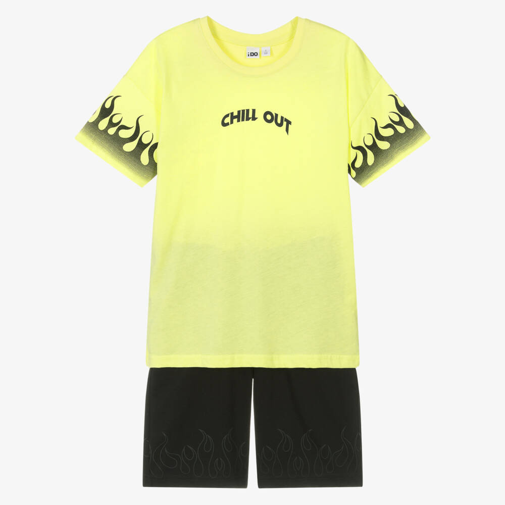 Neon yellow and black shorts set for older boys by iDO Junior, made in soft cotton jersey. Great for relaxed casual wear, the T-shirt has a black, fiery flame design on each sleeve and 'Chill Out' printed on the front. The shorts have a tonal flame print on the hem, slanted front pockets and a comfortable drawstring waistband.