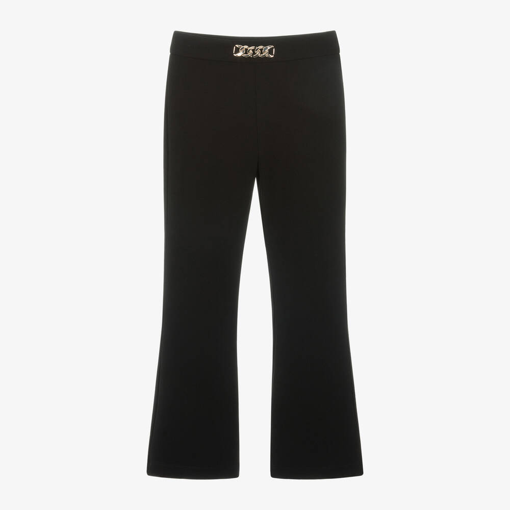 Black flared trousers for girls by iDO Junior, made in stretchy crépe jersey. They have a stylish gold chain accent on the waist, adding a touch of glamour and shine. There is a concealed zip on one side for a neat finish.