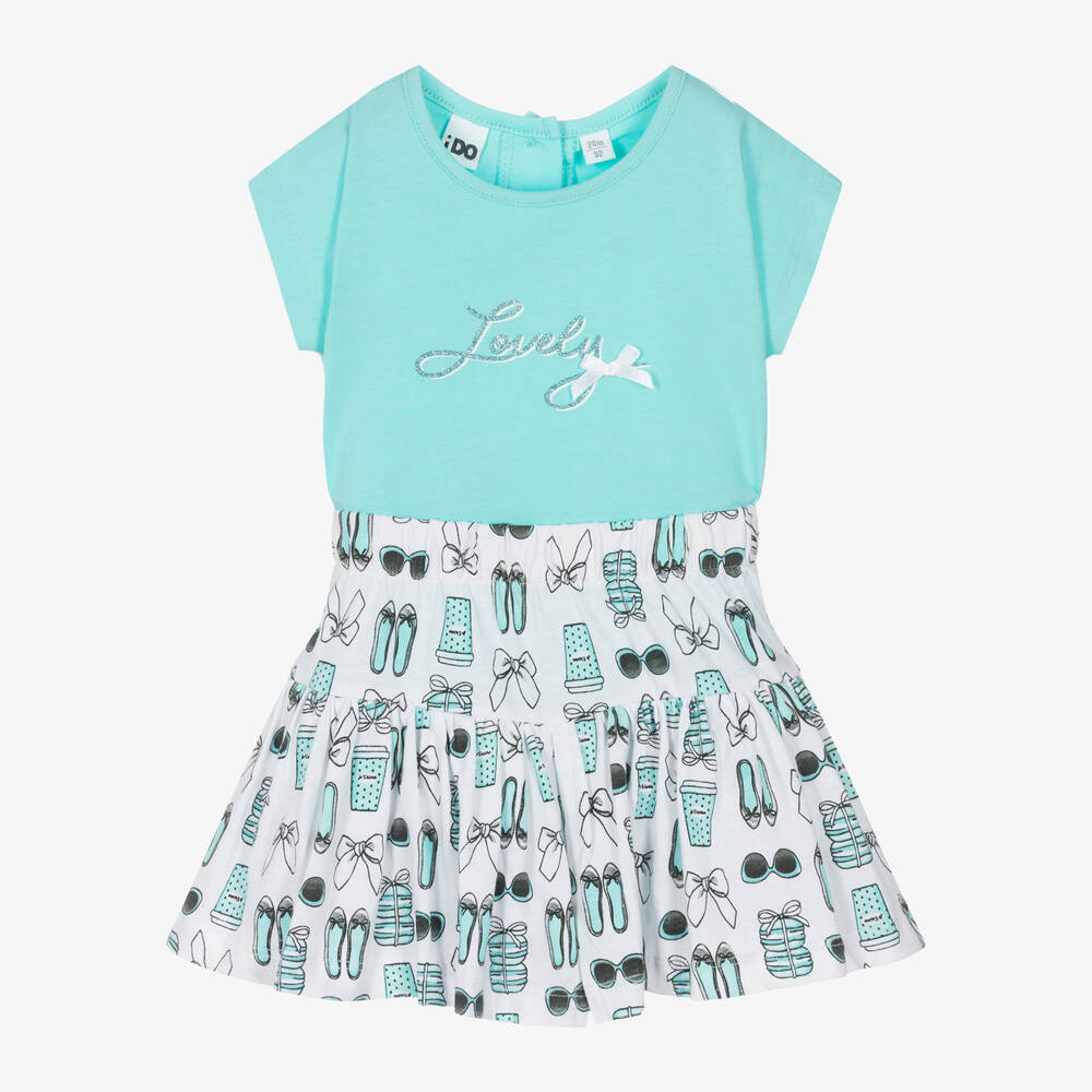 A turquoise blue skirt set for girls by iDO Baby, made in soft cotton jersey. The T-shirt has 'Lovely' printed on the front in glittery lettering, trimmed with a bow. There are useful button fastenings on the back. The coordinating skirt has attached shorts and an elasticated waist for a comfortable fit. It is patterned in a playful print that includes sunglasses and bows, for a fun finish.