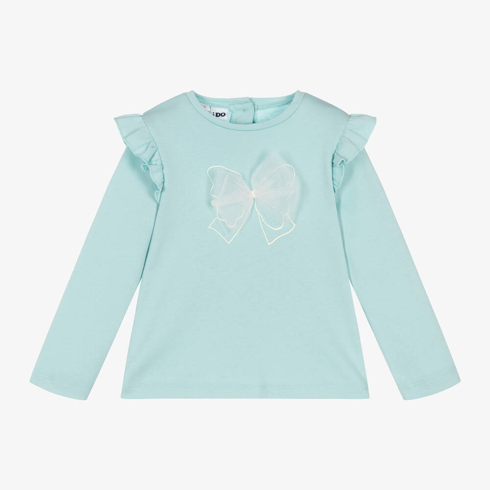 In a lovely shade of aqua blue, this long-sleeved top for girls is by iDO Baby. Made from soft cotton jersey, it has a printed ivory bow design on the chest with appliqué tulle detailing. Fastening with pearlescent branded buttons on the back, it has lovely frilled trims on the shoulders for a sweet finish.