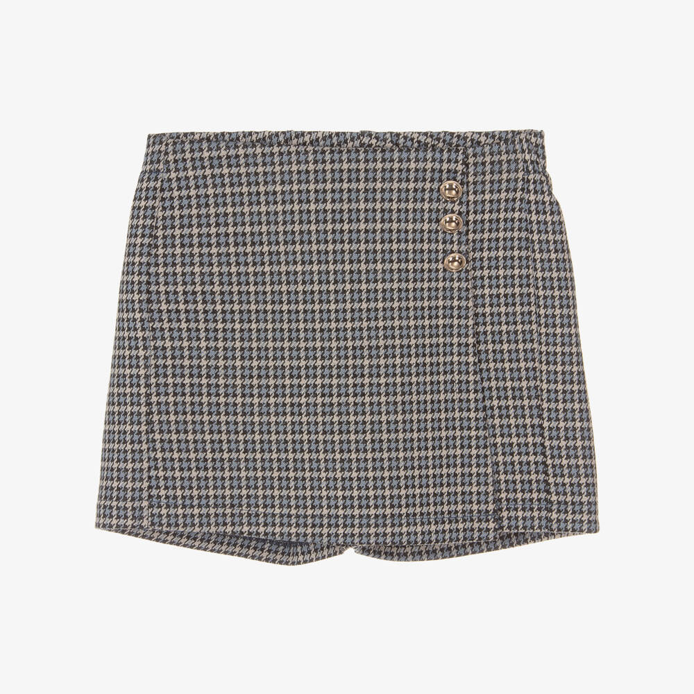 Smart blue and beige houndstooth skort for girls by Italian brand iDO Junior, with shiny gold, decorative buttons on the front. Super soft and comfortable, it is made in stretchy jersey with a waistband that is elasticated around the back. Easy to wear, it simply pulls up.