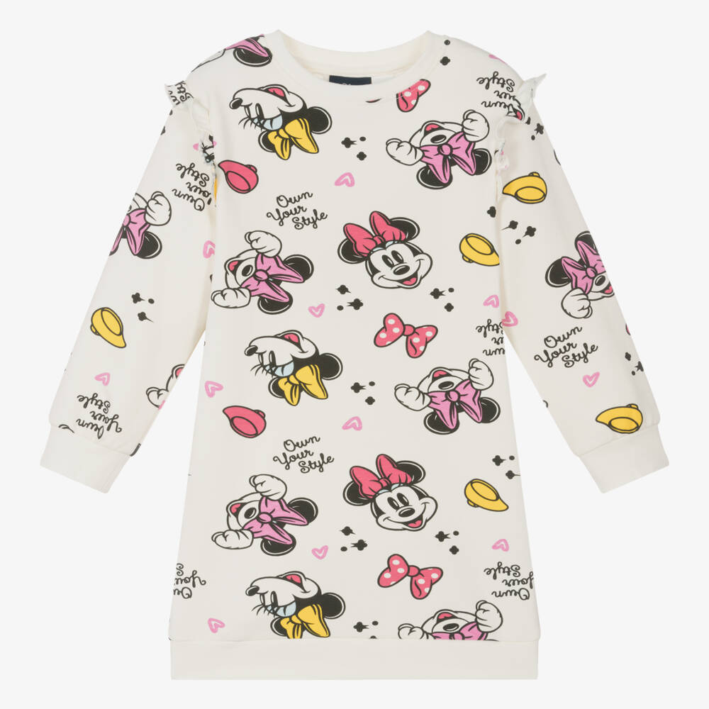 An ivory sweatshirt dress for girls by iDO Baby, made from soft cotton jersey. Cute and casual, it has a pink Minnie Mouse design with ruffles on the shoulders.
