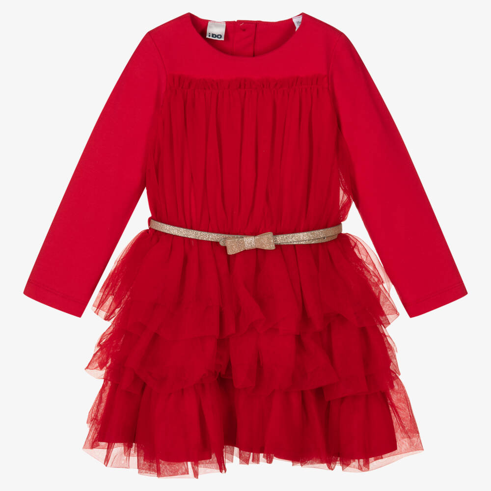 Suitable for a special occasion, this lovely red dress for girls is by iDO Baby. The comfortable cotton jersey bodice has a lightweight tulle overlay, whilst the lightweight twill skirt is covered in gorgeous tiers of ruffled tulle. It fastens with buttons on the back. Adding a touch of sparkle, the dress comes with a glittery gold, detachable belt.
