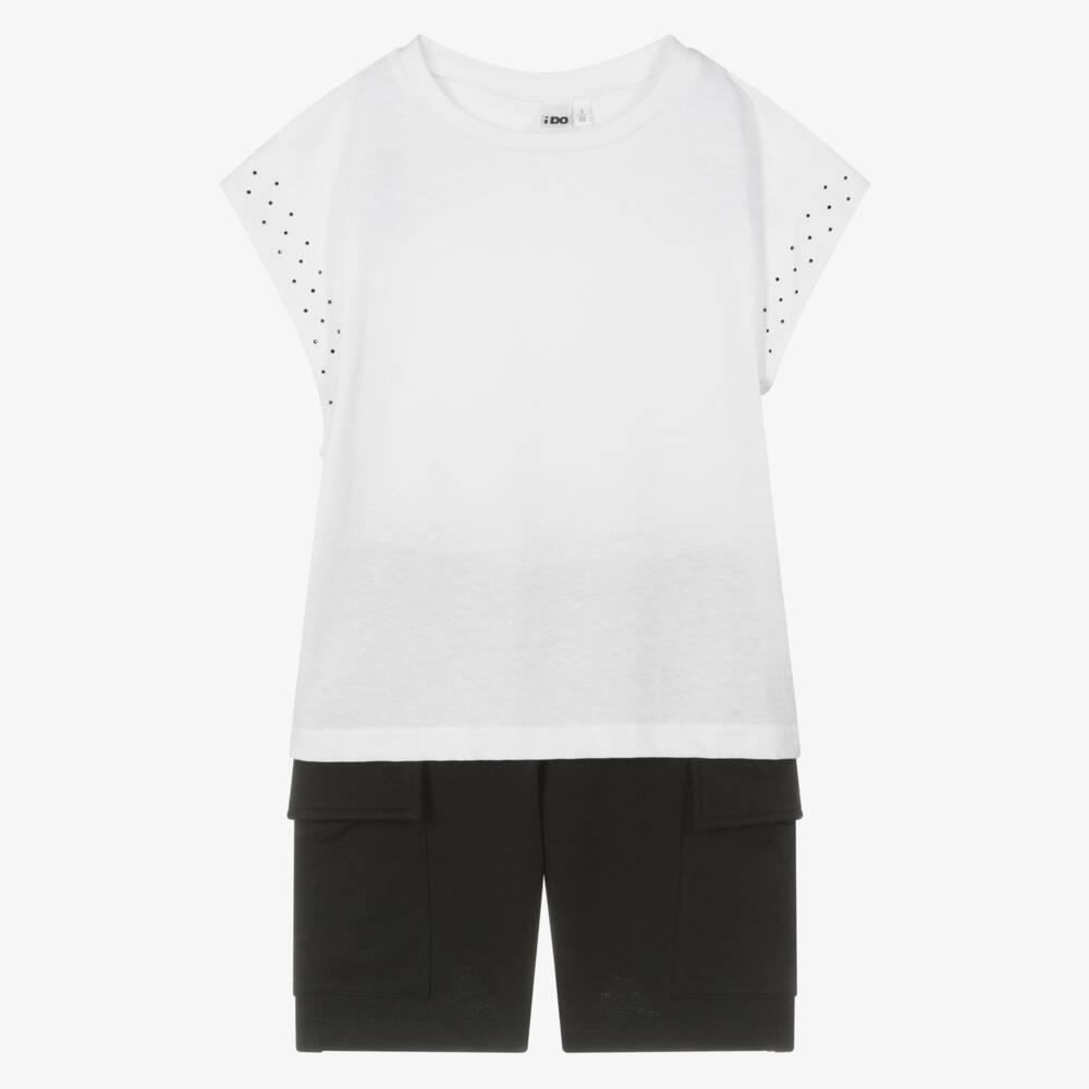 White and black shorts set for older girls by iDO Junior, made in soft cotton jersey. Designed in a boxy fit, the T-shirt has capped sleeves with rhinestone detailing adding a lovely touch of sparkle. The shorts are casually styled with cargo-style pockets on both legs and a stretchy elasticated waistband.
