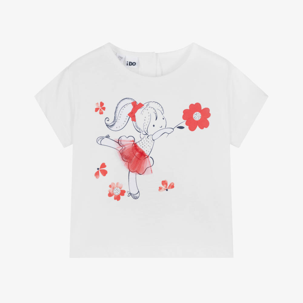 White T-shirt for girls by iDO Baby, made in comfortable cotton jersey. It has a pretty girl and red flower illustration on the front, detailed with red tulle and sparkly diamanté. It fastens with branded buttons on the back.
