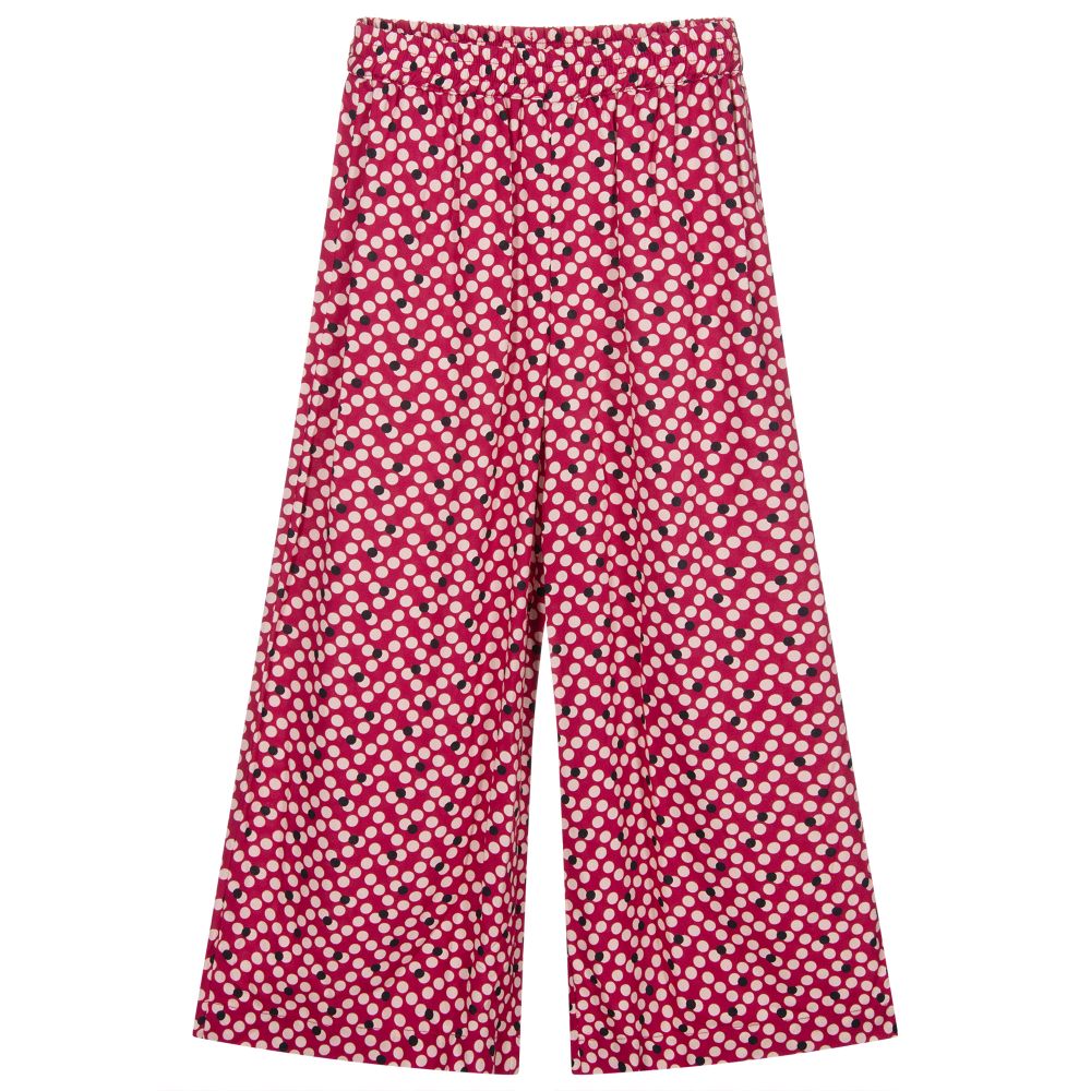 Girls dark pink wide legged trousers by iDO Junior, with a light pink and black dots pattern. Made from soft and lightweight viscose, they have a stretchy elasticated waistband for a good fit.