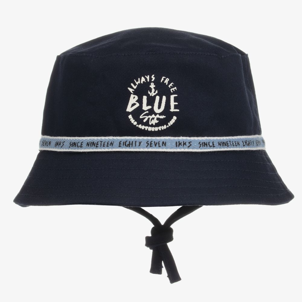 Navy blue bucket hat for boys by IKKS, made in soft cotton twill. With internal cords that fasten under the chin, it has blue logo tape trims and an ivory 'Blue' print on the front.