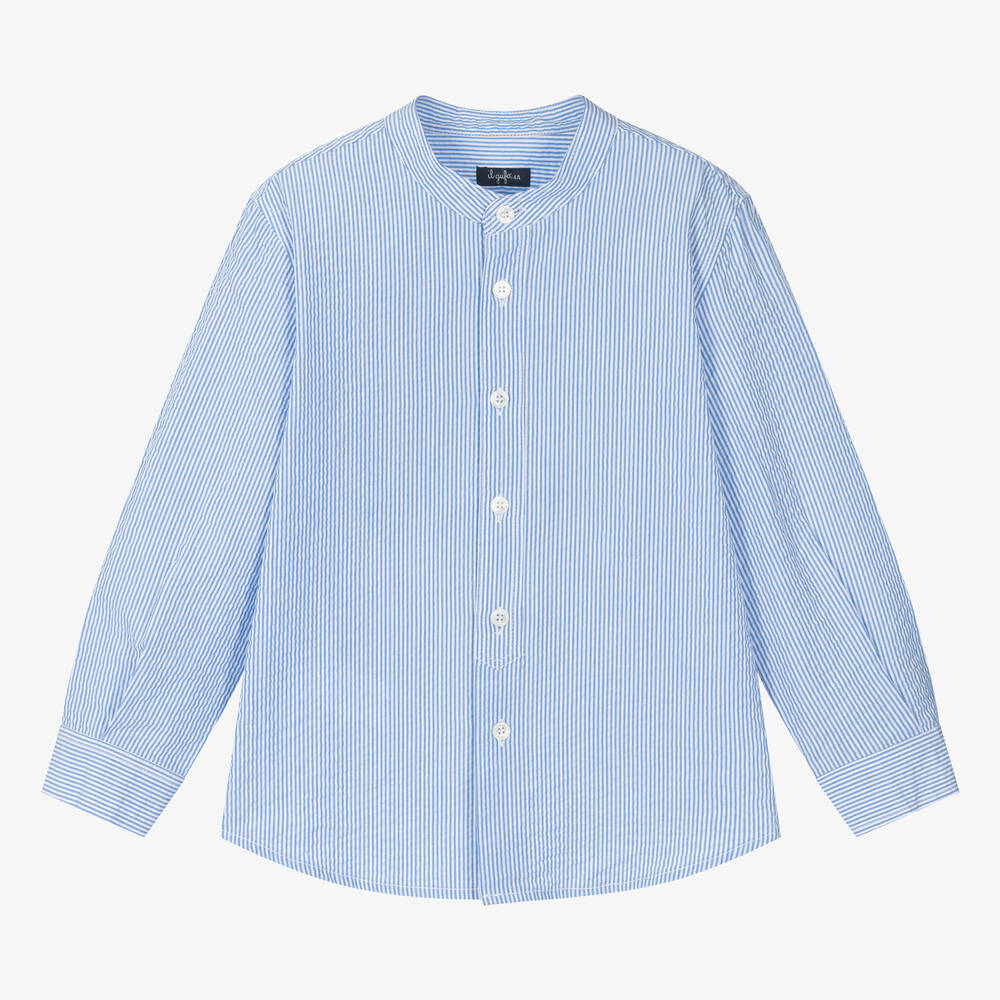 Timeless blue and white shirt for boys by luxury Italian brand Il Gufo, made from soft cotton seersucker. In a traditional collarless style, this long-sleeved shirt has a striped pattern with a smart, button-up front.