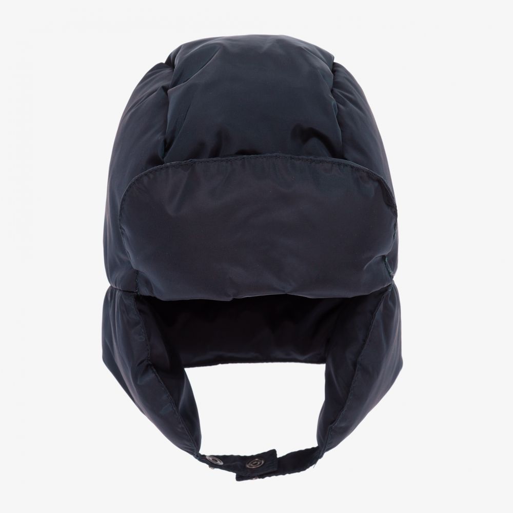 Navy blue down padded trapper hat for little boys by luxury brand Il Gufo. Soft and silky, it has a comfortable cotton jersey lining and a grey logo patch on the back. The chin strap is adjustable and fastens with a popper.
