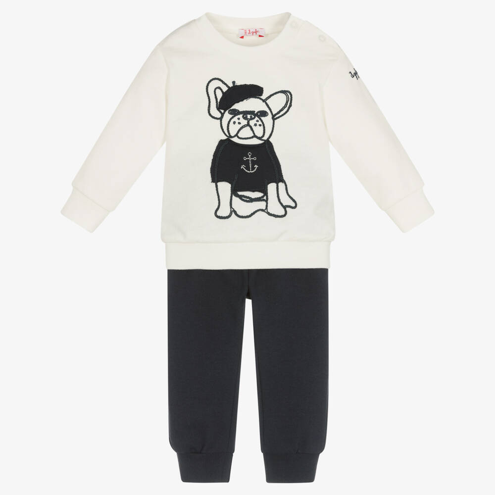 An adorable ivory and navy blue tracksuit for little boys by luxury Italian brand Il Gufo, made in soft and comfy cotton jersey. The top has a cute French bulldog motif on the front, with logo embroidery on one sleeve and easy-fastening poppers on one shoulder. The joggers have a gently elasticated waist, and both pieces have ribbed trims for a snug fit.