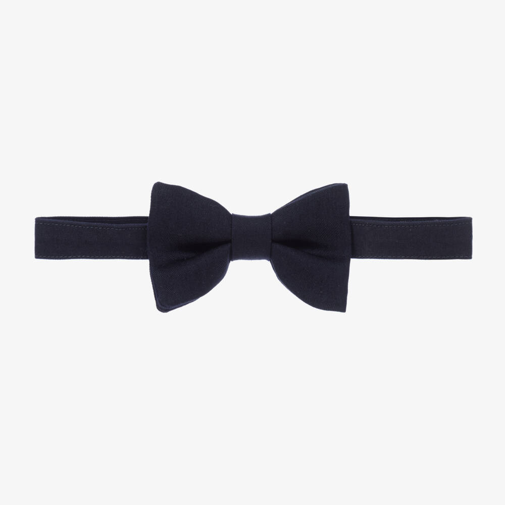 Smart navy blue bow tie for boys from luxury brand Il Gufo. Made in smooth cotton poplin it is soft against skin and has an easy-to-use velcro strap which can be adjusted for a better fit.