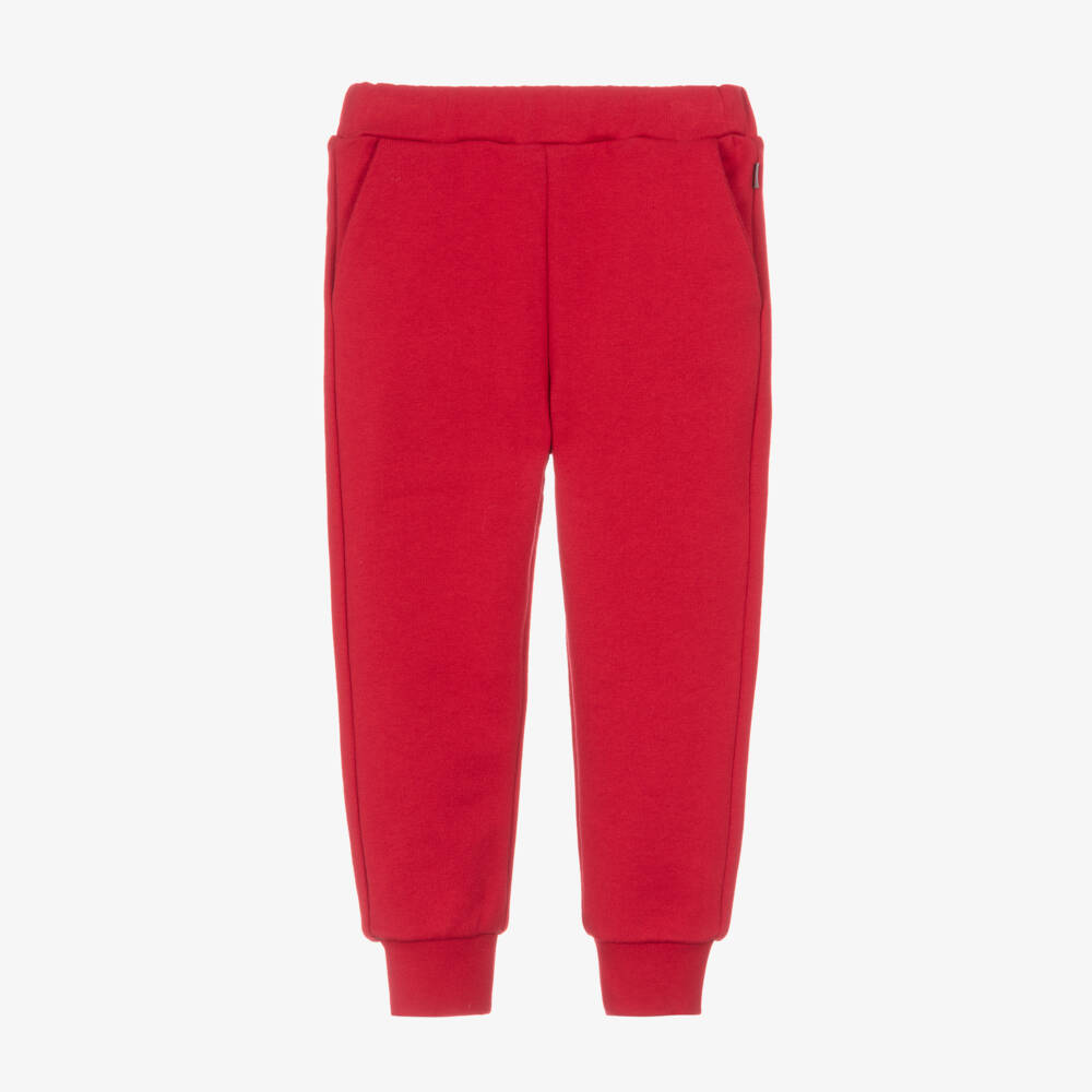 Bright red joggers for boys by luxury Italian brand, Il Gufo. Ideal for relaxed wear, these casual trousers are made in comfortable cotton sweatshirt jersey with cosy ribbed cuffs. They have useful front pockets and a logo tab on the hip for a subtle designer touch.