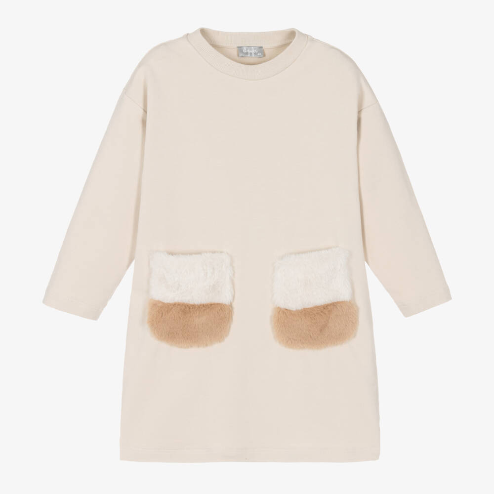 A light beige sweatshirt dress for girls from luxury label Il Gufo. Cool and casual, this soft, mid-weight cotton jersey dress has dropped shoulders, a ribbed crew neckline and super-fluffy faux fur pockets on the front in ivory and tan beige.