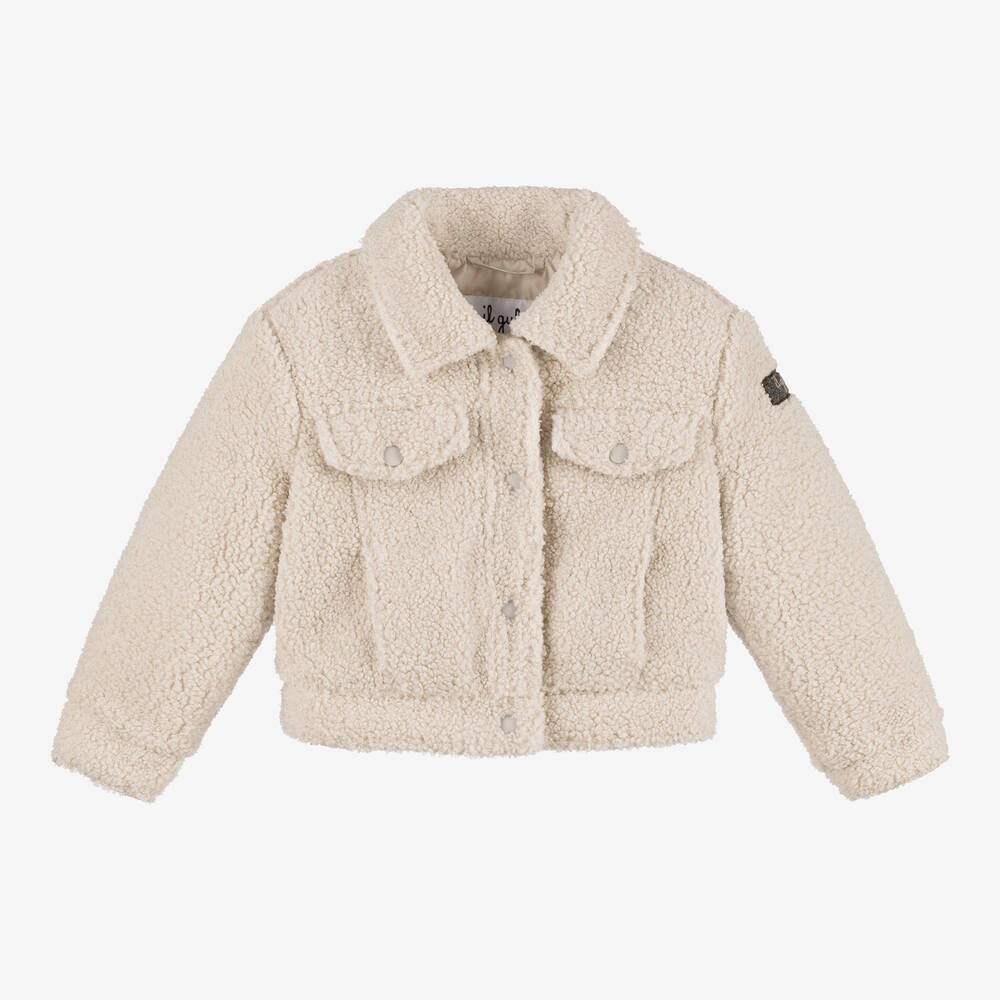 Beige jacket for girls by luxury Italian brand Il Gufo, made in soft teddy fleece. Cosy and comfortable, it has a silky lining and is lightly padded for warmth. There are easy-fastening poppers on the front, cuffs and flap pockets. Two additional pockets can be found on the front, with a logo patch on one sleeve adding a finishing designer touch.