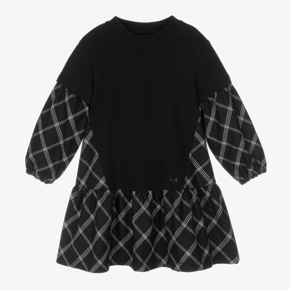 From Italian brand Il Gufo, a lovely dress for girls in a black and white monochromatic check. It is made in plain black, soft viscose jersey with brushed, lightweight cotton twill checked panelling for a comfortable layered look in one piece. Casual with a ribbed crew neck, this dropped waist look has gently elasticated sleeves and a subtle black logo print on the front.