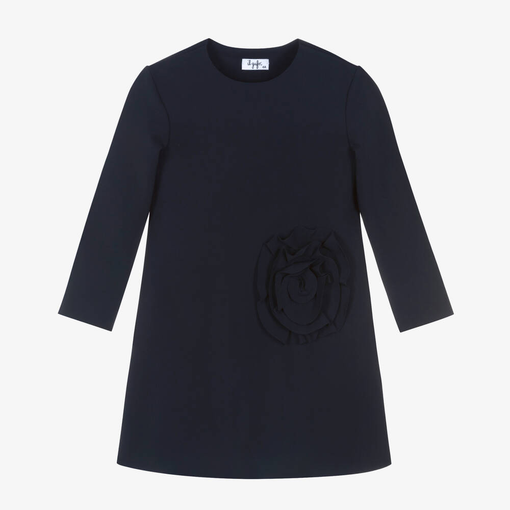Elegant navy blue dress for girls by luxury Italian brand Il Gufo, made in silky, stretchy jersey. In a chic A-line style, it has a statement rose appliqué on the front for a sophisticated touch. Easy to wear, it simply slips over the head.
