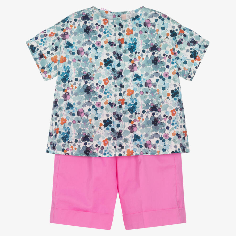 A pretty blue and pink shorts set for girls by luxury brand Il Gufo, made in the softest cotton poplin. Patterned in a watercolour floral design, the blouse has turn-up sleeves with a striped bow decorating the back. There are logo-embossed button fastenings on the back for a traditional finishing touch. To complete the look, the shorts have delicate pleats on the front, with smart side seam pockets. There is an adjustable waistband for the best fit.