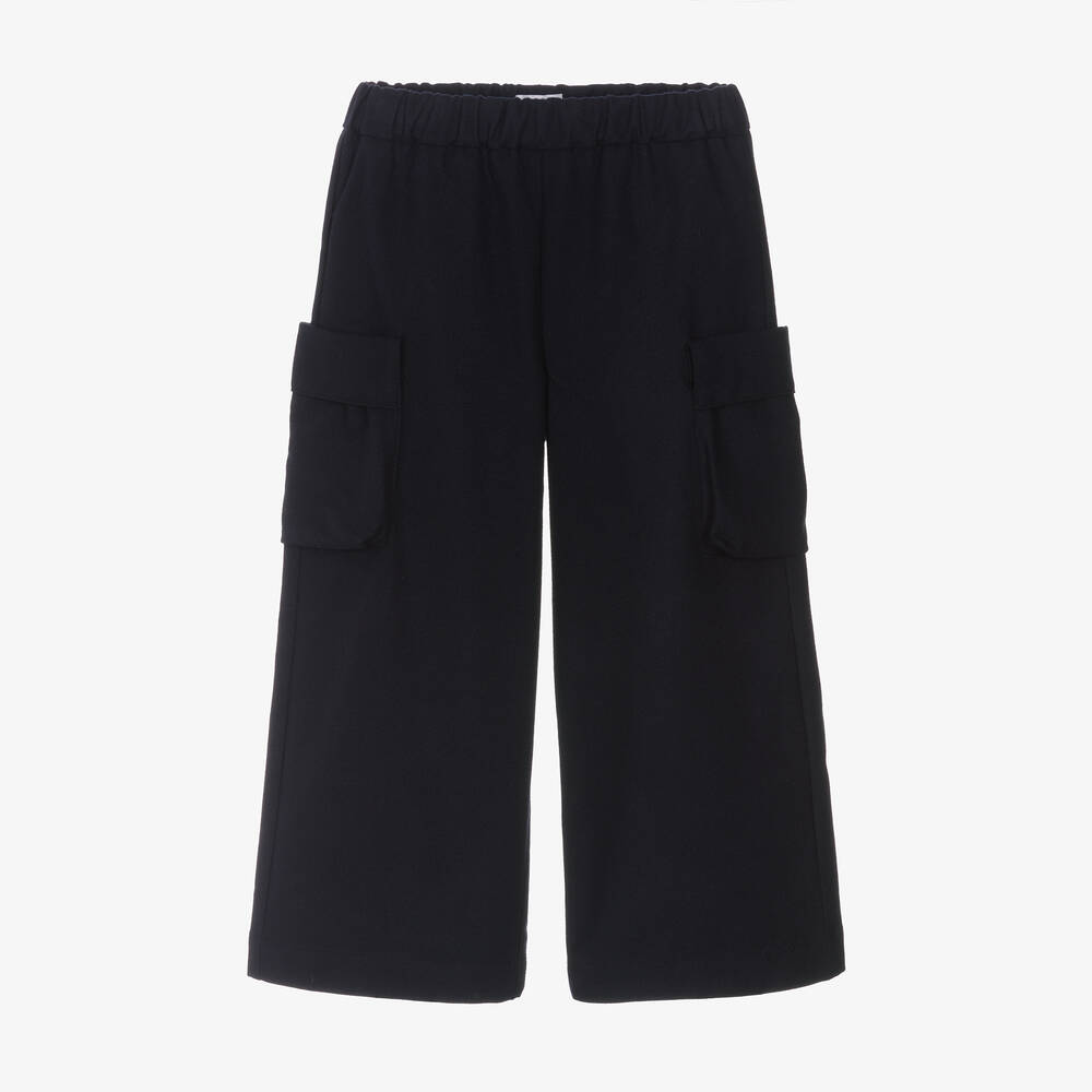 Navy blue wide leg trousers for girls by luxury Italian brand Il Gufo, made in a soft viscose blend with a cosy brushed feel. Easy wearing, they have cargo style pockets on each leg and an elasticated waist for a comfortable fit.