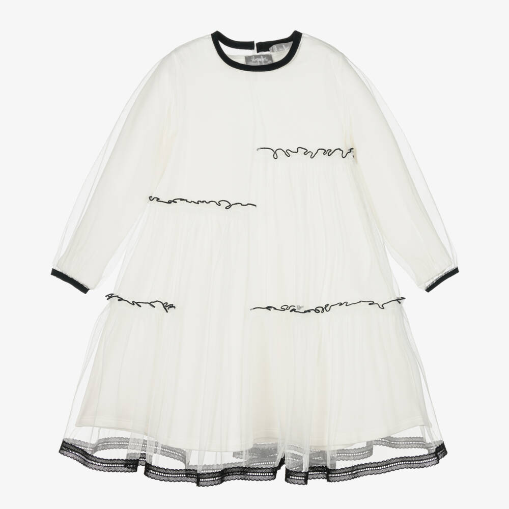 Gorgeous for special occasions, a pale ivory 2-in-1 dress for girls by Italian brand, Il Gufo, with a separate tulle overlay and inner dress. In a lovely trapeze shape, the fine tulle overlay has contrasting black trims, stitched edges on the ruffles and a delicate black lace trim around the hem. It fastens with buttons on the back. Easy to pull over the neck, the inner dress is made in soft and stretchy cotton jersey for comfortable wear.