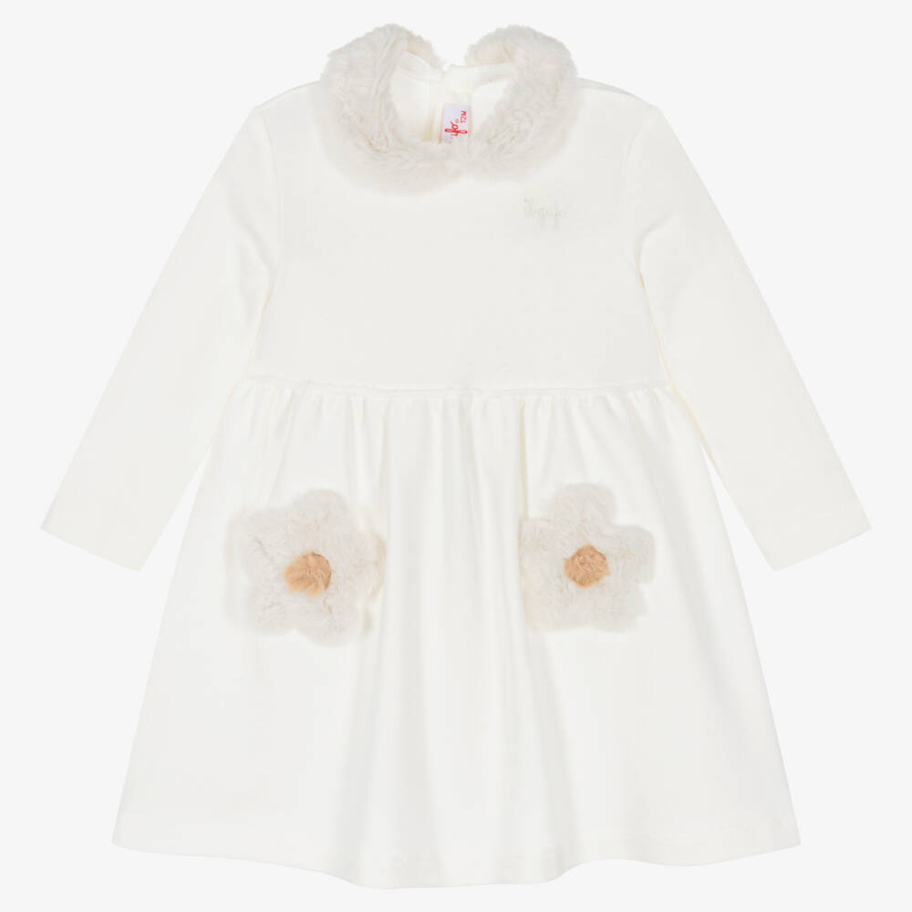 A lovely ivory dress for little girls by luxury brand Il Gufo, made from the softest cotton jersey. It has a faux fur Peter Pan collar with matching floral appliqués on the front for an adorable look. A tonal logo is embroidered on the chest and buttons fasten neatly on the back.