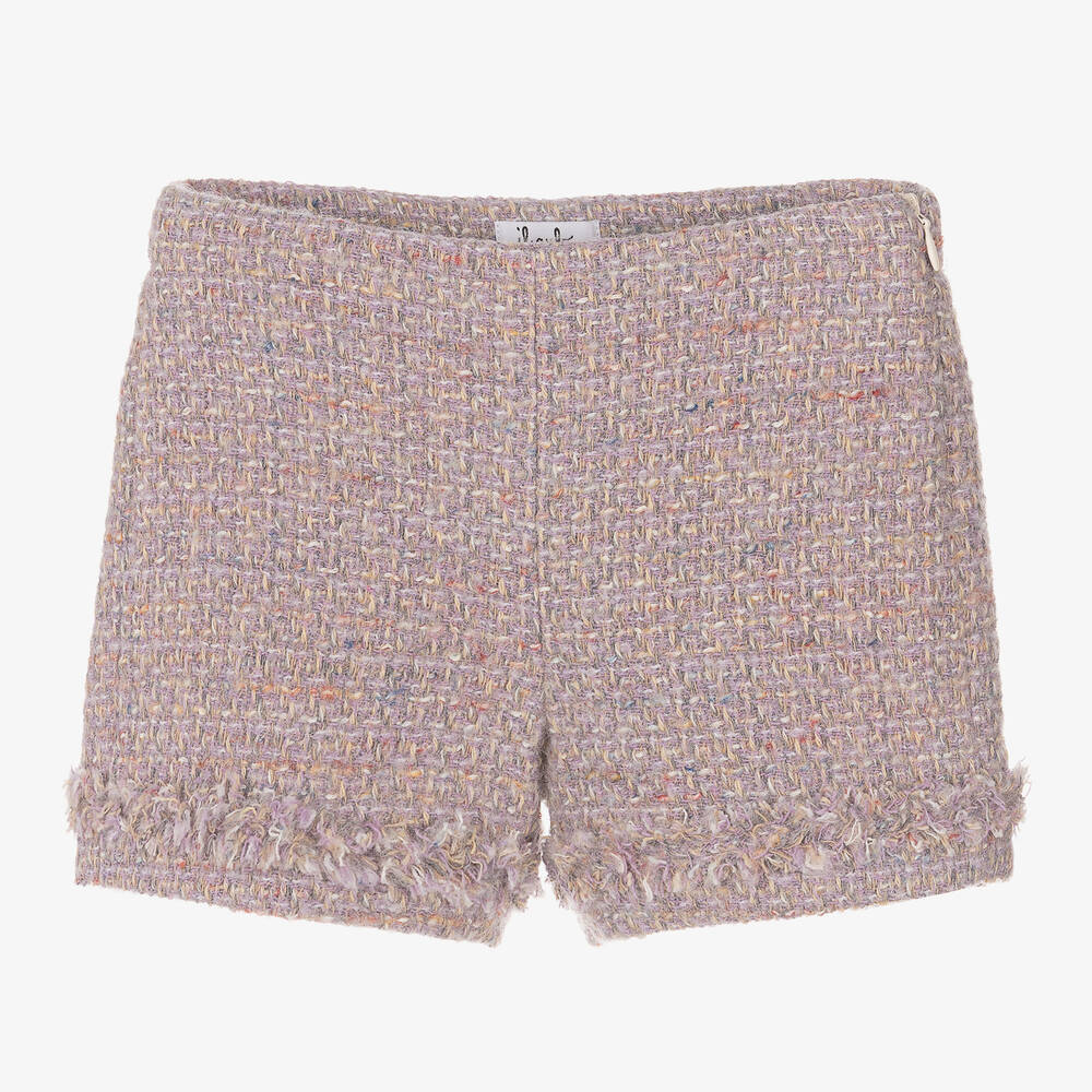 Smart lilac purple tweed shorts for girls by luxury Italian brand Il Gufo, with flecks of pink and yellow in the weave. They have a frayed trim around the cuffs and a discreet, concealed, side zip fastening, with an adjustable waistband for a great fit. They are fully lined in light, beige satin for comfort.