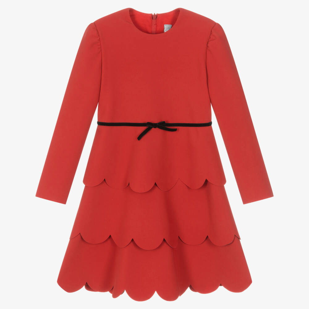 Simply elegant, red dress for girls from Italian brand, Il Gufo, with a black velvet ribbon and bow trim on the waist. Made in luxuriously smooth jersey in a lovely matte satin finish, the scalloped tiers drape beautifully to form a stunning A-line silhouette. The long sleeves are gathered at the shoulder for a subtly puffed look. It is lined in soft cotton jersey for added comfort, with a concealed back zip for a seamless finish.