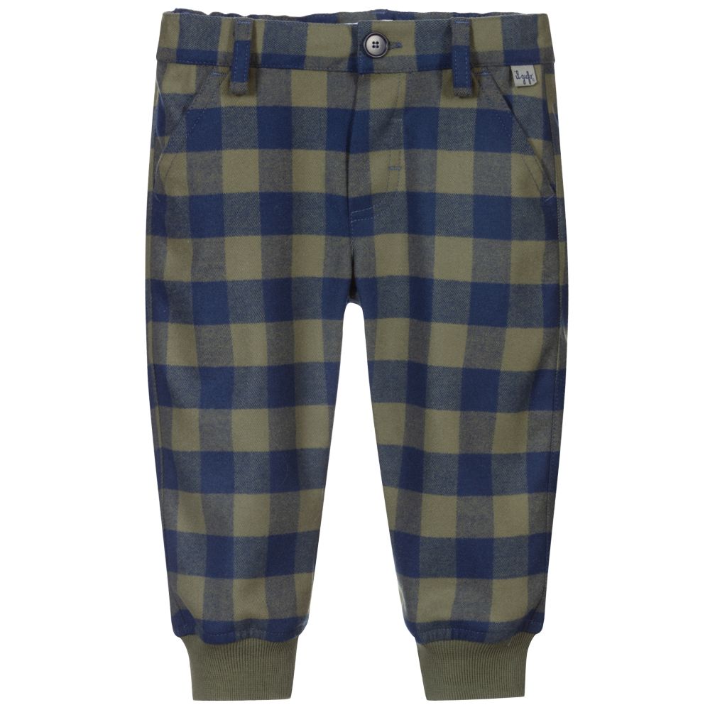 Younger boys green and blue check trousers by luxury brand, Il Gufo. Made in a soft, brushed fabric, these smart trousers have front button fastening and a useful adjustable waist, with belt loops and side pockets. They have ribbed, stretchy ankle cuffs.