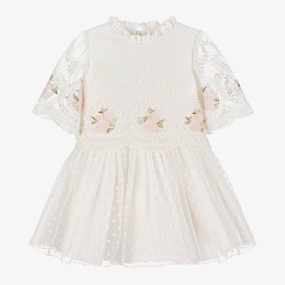 Enchanting ivory dress for girls by Irpa, ideal for special occasions. Made from smooth satin twill with a beautifully embroidered tulle overlay, there are gorgeous pale pink and green rose motifs decorating the bodice. For added elegance and charm, it has sheer short sleeves and a frilled high neckline and the gathered skirt has an added layer of tulle creating extra volume. The dress is fully lined for comfort and fastens neatly with a concealed zip on the back.