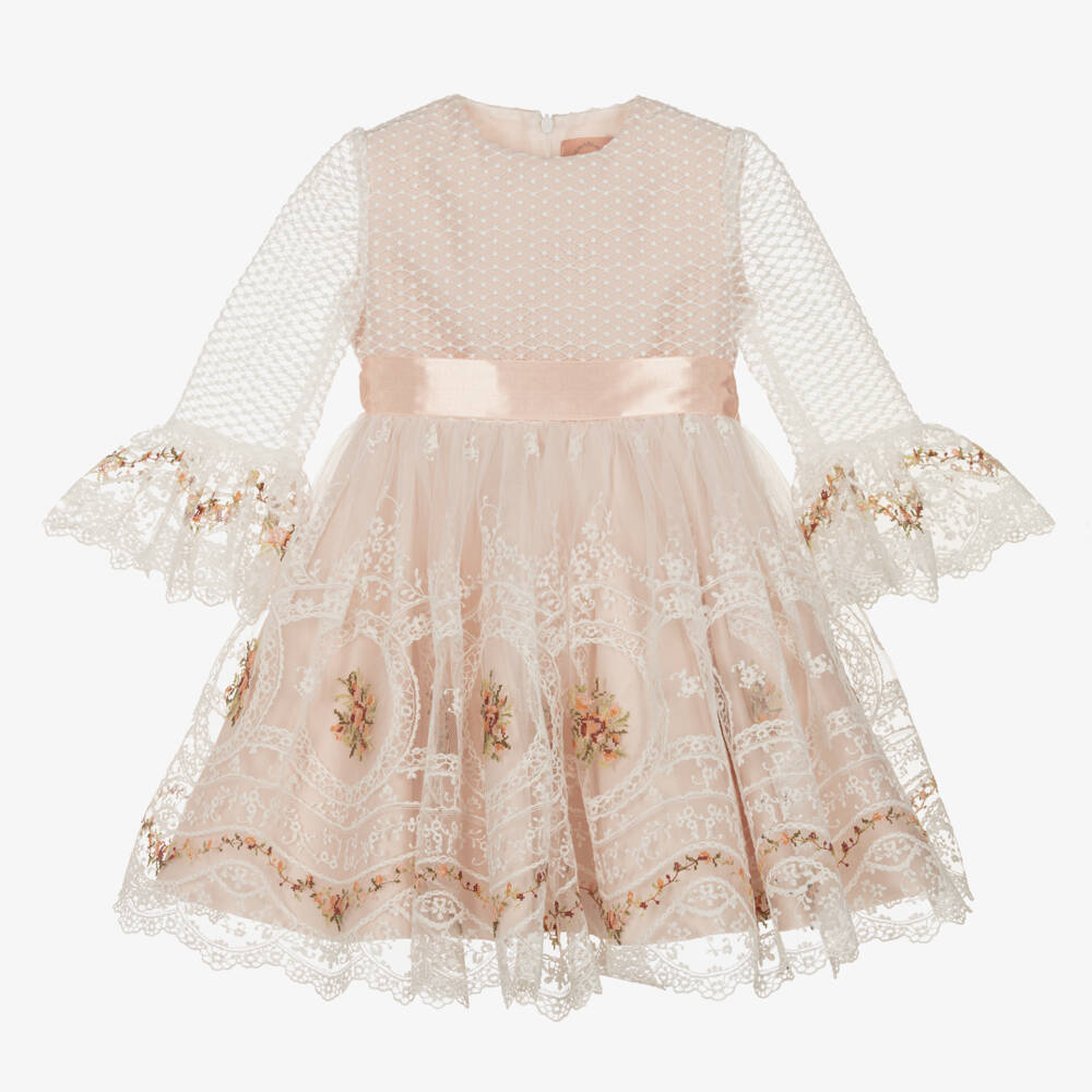 An ivory tulle dress for girls by Irpa, ideal for special occasions. Lined in a silky pale pink satin, this lovely dress has a gorgeous lace design. The skirt is beautifully embroidered with pink and green florals and for added charm, the sheer three-quarter length sleeves have matching embroidery on the frilled cuffs. For a pretty finishing touch, the waist is trimmed by a satin ribbon that can tie into a bow on the back. A structured trim on the lightweight voile lining adds volume and for a neat finish, it fastens with a concealed zip on the back.