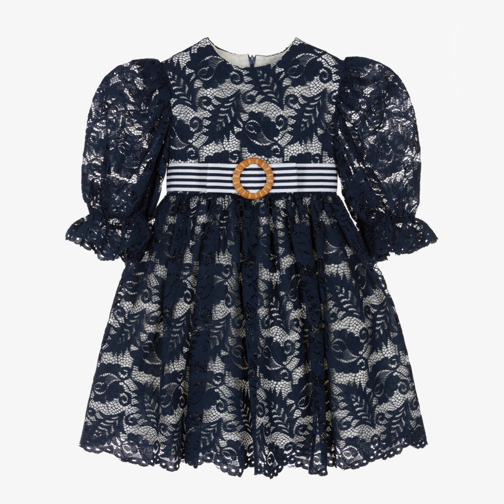 Super stylish, this navy blue dress for girls is by luxury brand Irpa. Made from beautiful floral lace with a white crêpe chiffon underlayer, it has sheer puffed sleeves with subtly scalloped cuffs and hem. Delightfully elegant, the attached striped belt has a pretty bow embellishment with a brown wicker-style circular buckle for a chic finish. Fastening with a concealed zip, it is lined with a smooth cotton weave with an additional tulle panel for added volume in the skirt.