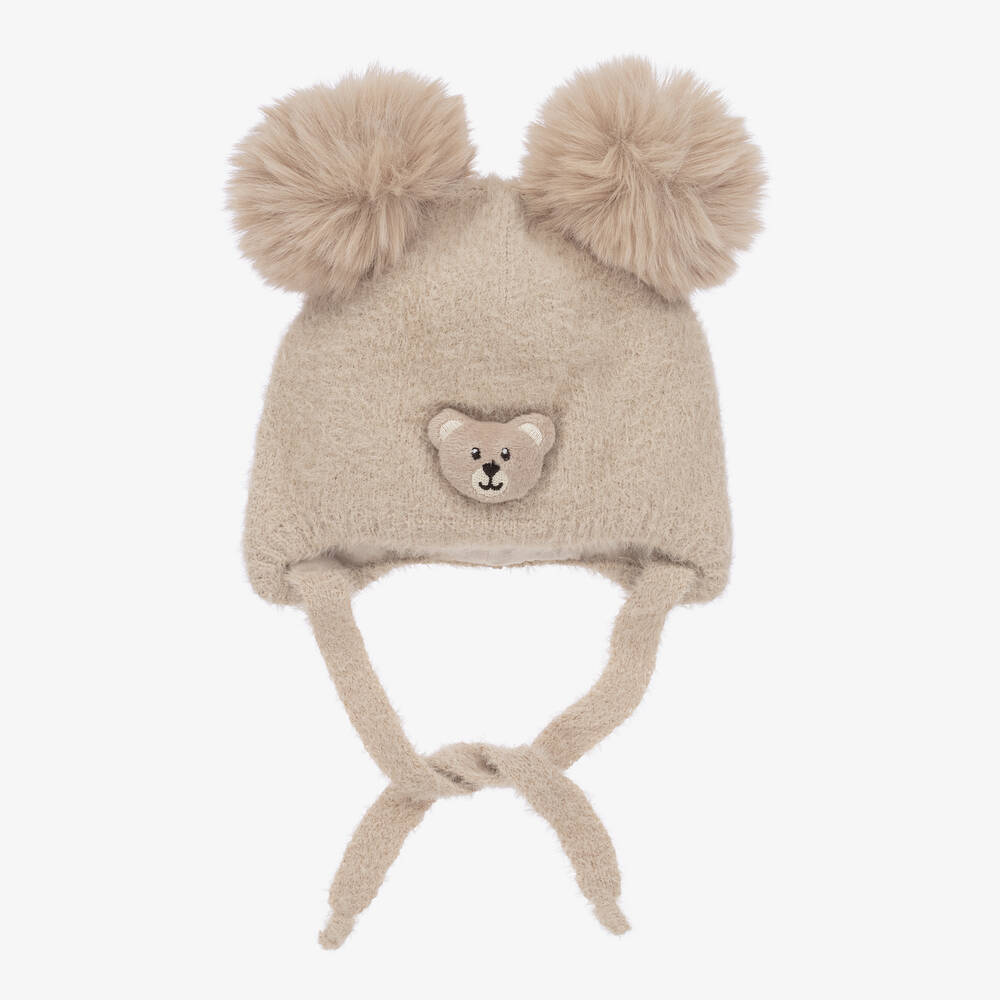 Cosy beige hat for little boys and girls by Jamiks, made in a beautifully soft blend of wool and viscose, with a touch of luxurious cashmere. There is an adorable teddy bear appliqué on the front and wonderfully fluffy pom-poms on the top. Lined in soft cotton jersey for additional warmth, this cute hat secures with knitted ties under the chin.