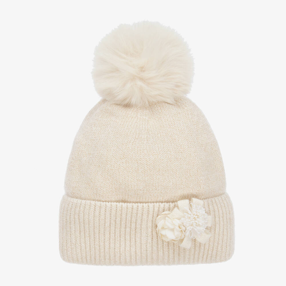 A pale beige hat for girls by Jamiks, with a tonal faux fur pom-pom on top. Knitted with a blend of wool and cashmere, this warm hat has subtle gold sparkles running through the weave. Fully lined in soft cotton jersey, it has a pretty flower embellishment stitched to the wide ribbed trim for a sweet finish.
