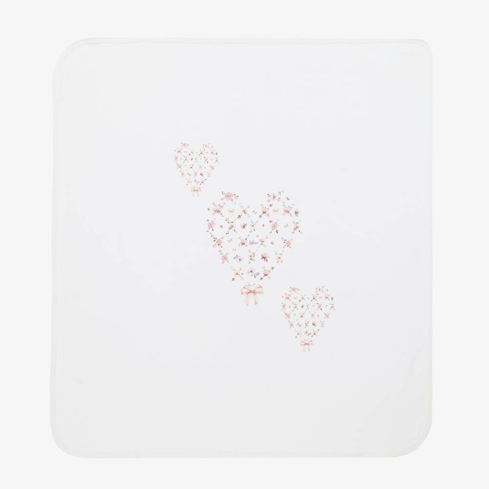 Ivory swaddle for baby girls by Jamiks, made in a soft and stretchy cotton jersey. It has a beautiful floral heart design on one side, in gorgeous pink tones. A versatile nursery accessory, it can be used as a swaddle blanket, burping cloth or nursing cover.