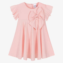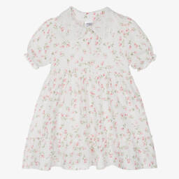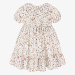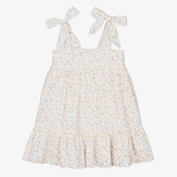 An ivory dress for little girls by Jamiks, with a row of pretty bows and an enamelled heart charm detailing. The dropped waist bodice is made in a cotton and viscose blend in a ribbed knit with subtle gold thread for added shimmer. The full-circle, bouclé jersey skirt finishes off the look with a cute twirly look.