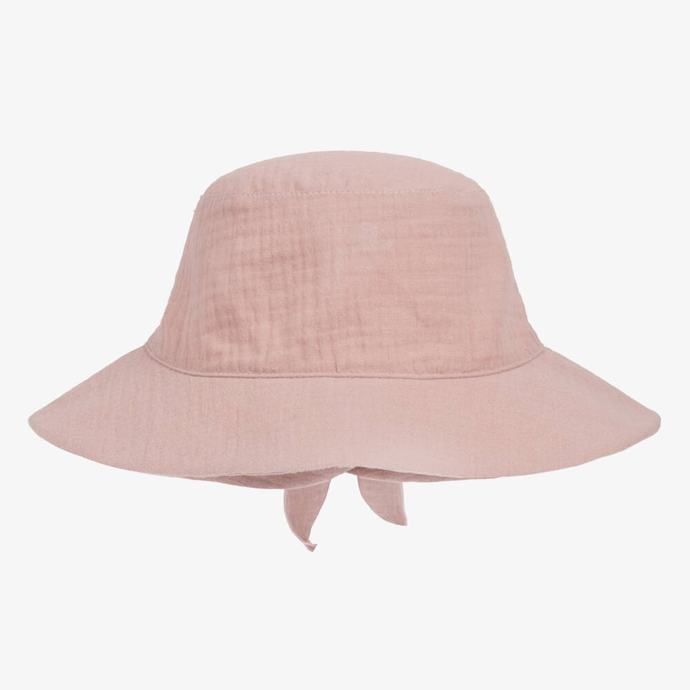Charming dusky pink summer hat for girls by Jamiks, made in lightweight organic cotton seersucker. It has a wide brim to help protect delicate eyes from the sun and ties at the back in a bow for a feminine finish.