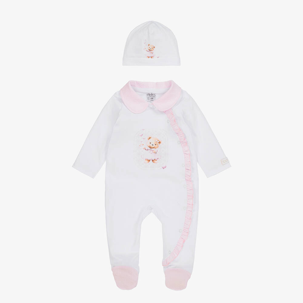 Lovely for baby girls, a white cotton babygrow and hat set from Jamiks, made in soft, comfortable jersey. Designed with textured pink trims and ruffles, it fastens easily with poppers on the front. Both the babygrow and layette hat feature a cute bear print for a sweet, coordinated finish.