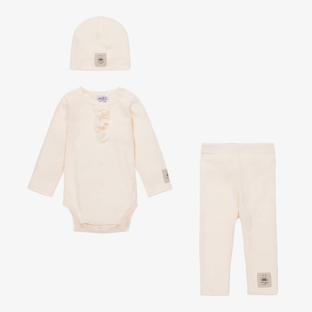 Dark ivory babysuit set for boys and girls by Polish brand Jamiks, made in comfortable, ribbed cotton jersey. The bodysuit has a pretty ruffe on the front and picot trims, with popper fastenings on one shoulder and between the legs, so it always stays tucked in and tidy. The trousers have a comfortable, elasticated waistband and are easy to wear, simply pulling up. All pieces of the set have the designer's logo patch sewn on one side.