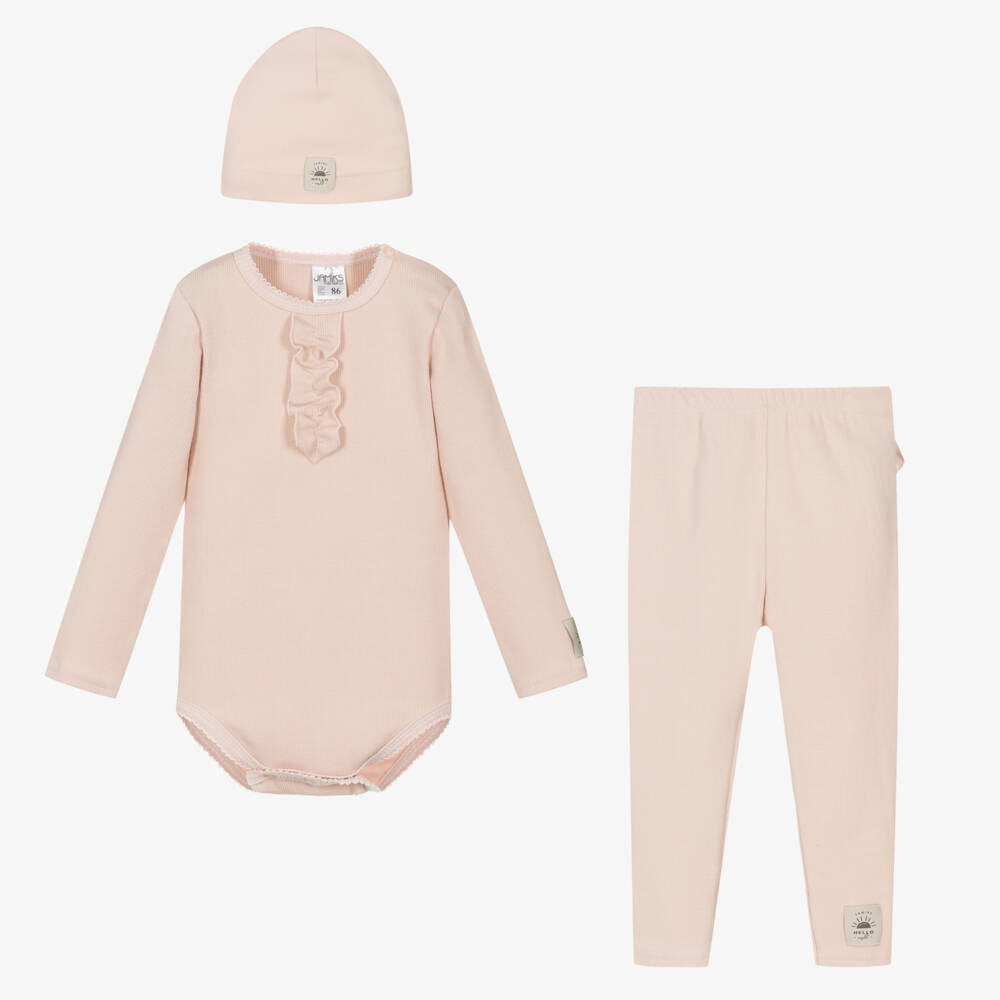 Dusky pink babysuit set for girls by Polish brand Jamiks, made in comfortable, ribbed cotton jersey. The bodysuit has a pretty ruffe on the front and picot trims, with popper fastenings on one shoulder and between the legs, so it always stays tucked in and tidy. The trousers have a comfortable, elasticated waistband and are easy to wear, simply pulling up. All pieces of the set have the designer's logo patch sewn on one side.