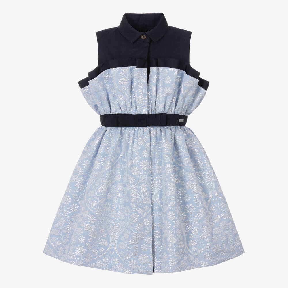 Exclusive to Childrensalon, a lovely blue shirt dress for girls by British brand Jessie and James London. Ideal for a special occasion, this sleeveless design has a smart collared neckline and concealed button fastenings on the front. There are two layers of decorative frills around the bodice, extending beautifully from the waist to create a distinctive silhouette. The light blue skirt is woven with shimmering silver florals and the fixed grosgrain belt is trimmed with a branded metal tag on the waistline. A lightweight cotton voile lining ensures a gentle feel against the skin.