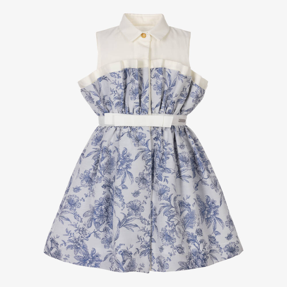 Exclusive to Childrensalon, a lovely blue and ivory shirt dress for girls by British brand Jessie and James London. Ideal for a special occasion, this sleeveless design has a smart collared neckline and concealed button fastenings on the front. There are two layers of decorative frills around the bodice, extending beautifully from the waist to create a distinctive silhouette. The jacquard skirt is woven with a navy blue ornamental floral design and the fixed grosgrain belt is trimmed with a branded metal tag on the waistline. A lightweight cotton voile lining ensures a gentle feel against the skin.