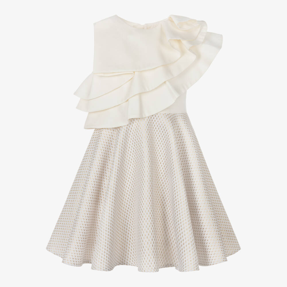 Exclusive to Childrensalon, an elegant ivory dress for girls by British designer Jessie and James London. Lovely for a special occasion, this sleeveless design has a soft twill bodice with layered ruffles over one shoulder for a unique silhouette. Gently gathered at the waist, the full, circular skirt is beautifully woven with shimmering gold dots and is fully lined with lightweight cotton voile. It fastens neatly on the back with a concealed zip and branded amber-coloured button.