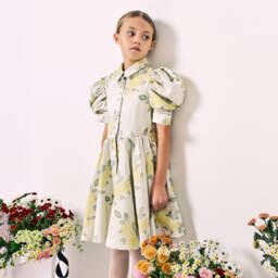 فستان بنات أنيق باللون العاجي من جيسي آند جيمس لندن، مصنوع من الجاكار الخفيف مع لمعة جذابة. يتميز هذا التصميم الرائع بنقشة زهور صفراء وخضراء مع أكمام كبيرة منتفخة وأزرار مغطاة بالقماش في الأمام. يحتوي على جيوب جانبية عملية وبطانة كاملة من القطن الفوال لراحة إضافية.