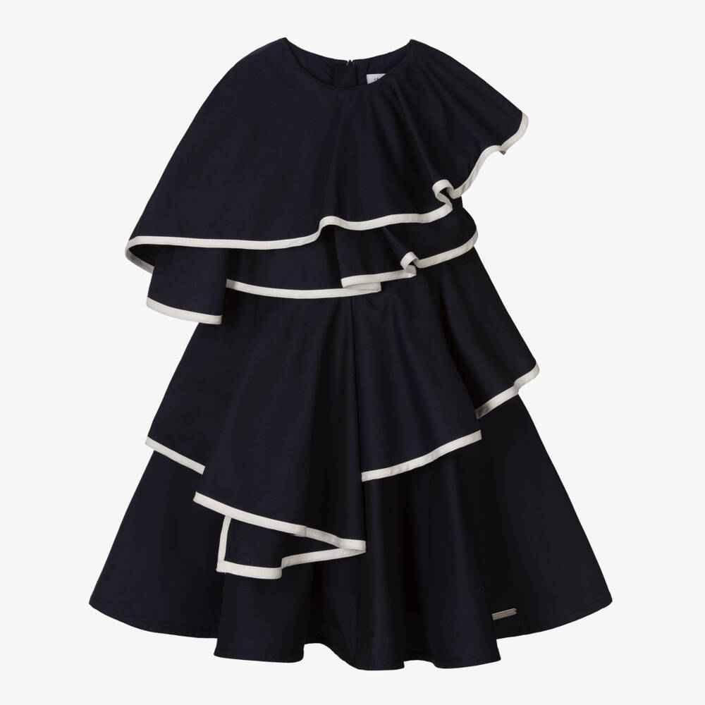 A lovely navy blue dress for girls by Jessie and James London, woven in soft cotton. Ideal for a special occasion, this sleeveless design has an asymmetrical silhouette with beautifully layered ruffles over one shoulder and down the body with contrasting white trims. There is a branded metal tag on the hemline and an amber-coloured button overwrap on the back. The dress is fully lined with soft cotton voile and fastens neatly on the back with a concealed zip.