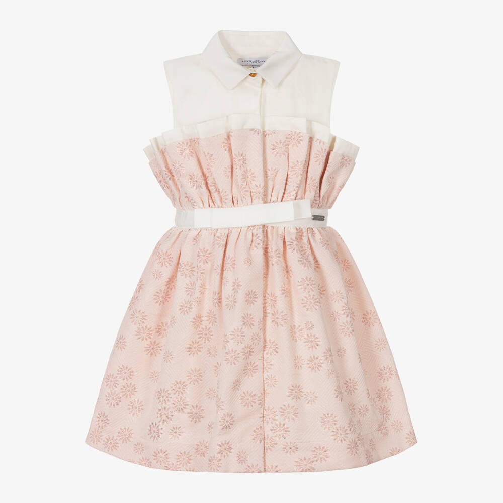 A lovely ivory and pink shirt dress for girls by British brand Jessie and James London. Ideal for a special occasion, this sleeveless design has a smart collared neckline and concealed button fastenings on the front. There are decorative ruffles around the bodice, extending beautifully from the waist to create a distinctive silhouette. The pale pink skirt is woven with shimmering pink florals and the fixed grosgrain belt is trimmed with a branded metal tag on the waistline. A lightweight cotton voile lining ensures a gentle feel against the skin.