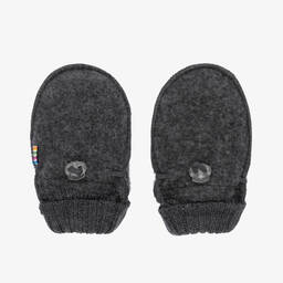 Sweet dark grey thermal mittens for baby boys and girls by Joha. They are knitted in luxuriously soft and fleecy Merino wool with ribbed trims to keep their hands cosy. An adjustable toggle drawstring fastens on the front for a secure fit.