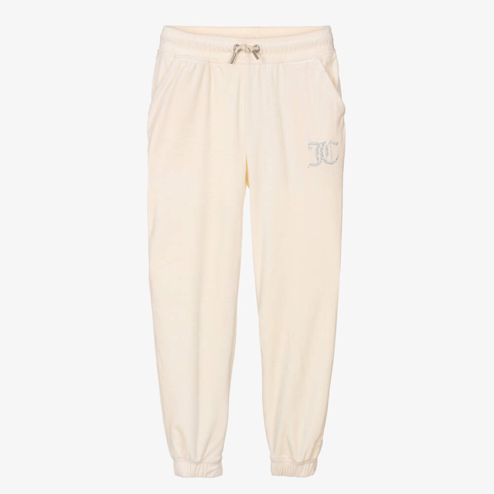 Gorgeous ivory joggers for girls by Juicy Couture, made in beautifully soft velour for a cosy fit. They have a JC silver diamanté logo appliqué on one leg for a touch of branded sparkle. For comfort, they have a stretchy drawstring waist and ribbed trims on the cuffs.
