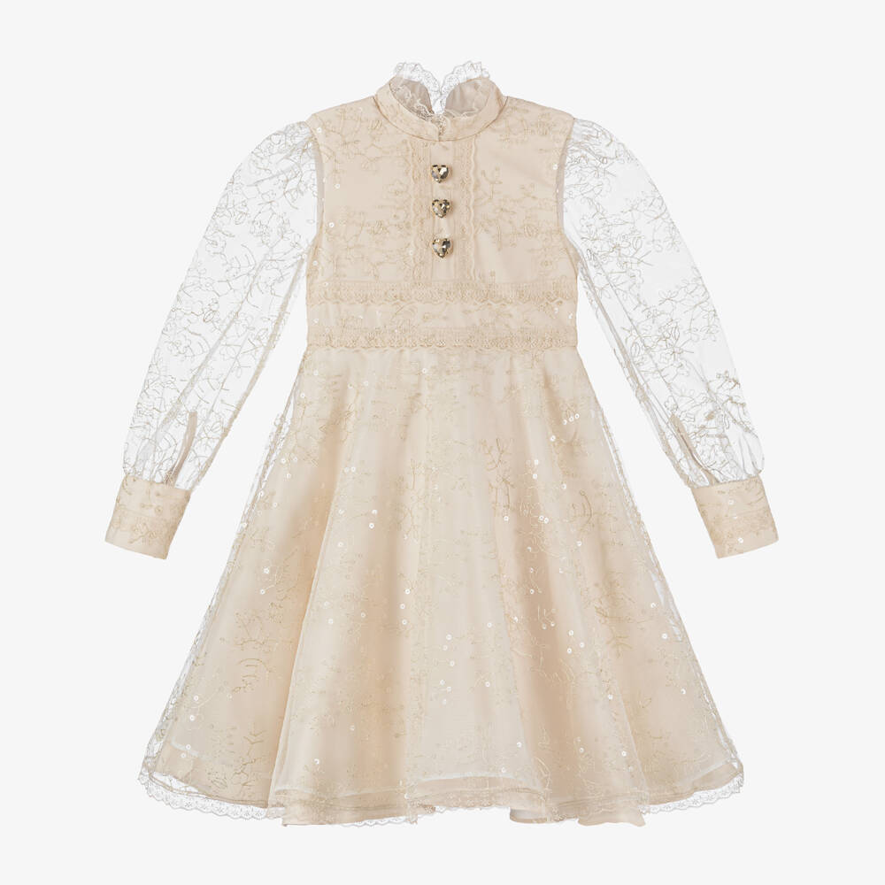 A gorgeous beige special occasion dress for girls by Junona. Delightfully elegant, it is made from lightweight tulle with romantic pale gold embroidery and a smooth satin underlayer. The sheer long sleeves have wide cuffs with gold lion-embossed buttons and pretty lace trims that match the detailing on the high neckline, bodice, and hem. There are three crystal heart embellishments on the chest for added glamour and sparkle. Lined in soft cotton with a layer of tulle for added volume, it fastens with a concealed zip on the back.