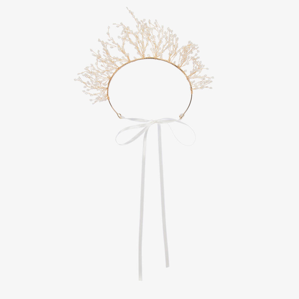 Utterly divine, this gold tiara hairband for girls by Junona is ideal for special occasions. Romantic and enchanting, the tiny pearly white beads are suspended on malleable wires in a pretty floral formation for added femininity and charm. In the style of a garland, the flexible band secures with a silky white ribbon at the back for an elegant finish.